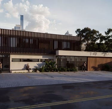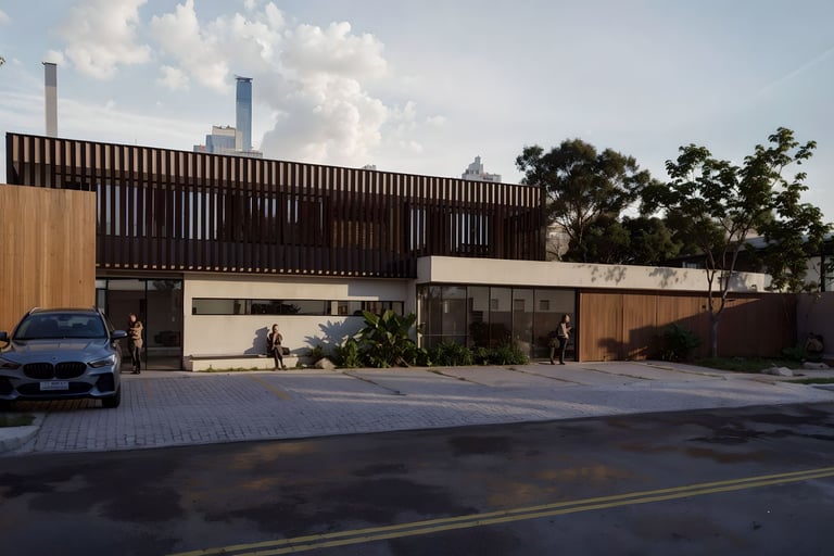 Transformei esta casa em uma clínica moderna e minimalista, incorporando elementos que destacam sua beleza linear e contemporânea. A fachada agora apresenta um brise metálico que cria linhas limpas e sofisticadas, além de elementos em diferentes níveis para adicionar profundidade e volume.